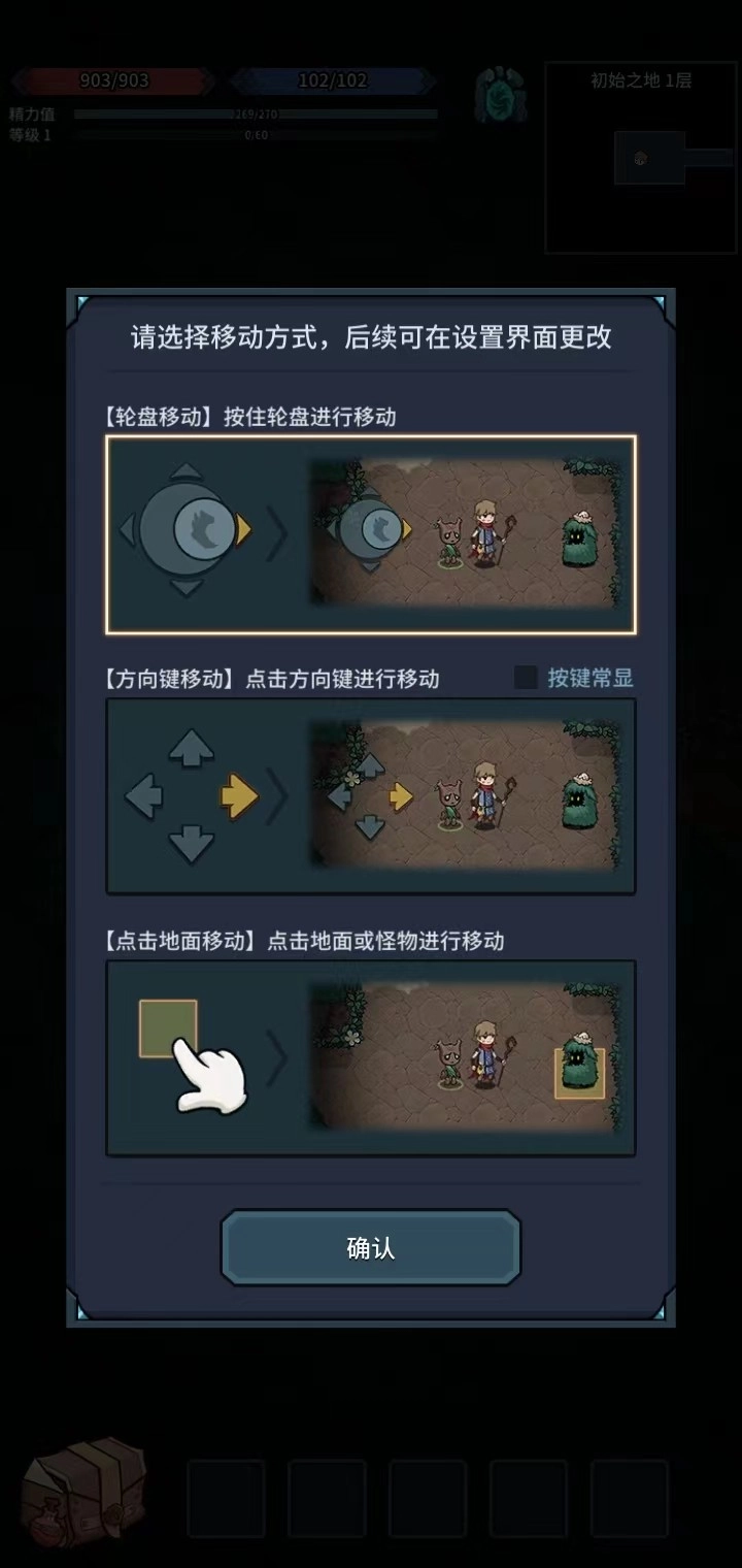 4、然后需要选择一种移动方式,一般来说是默认选择第一种的,不过如果玩家用的不舒服,可以在设置界面中更改;