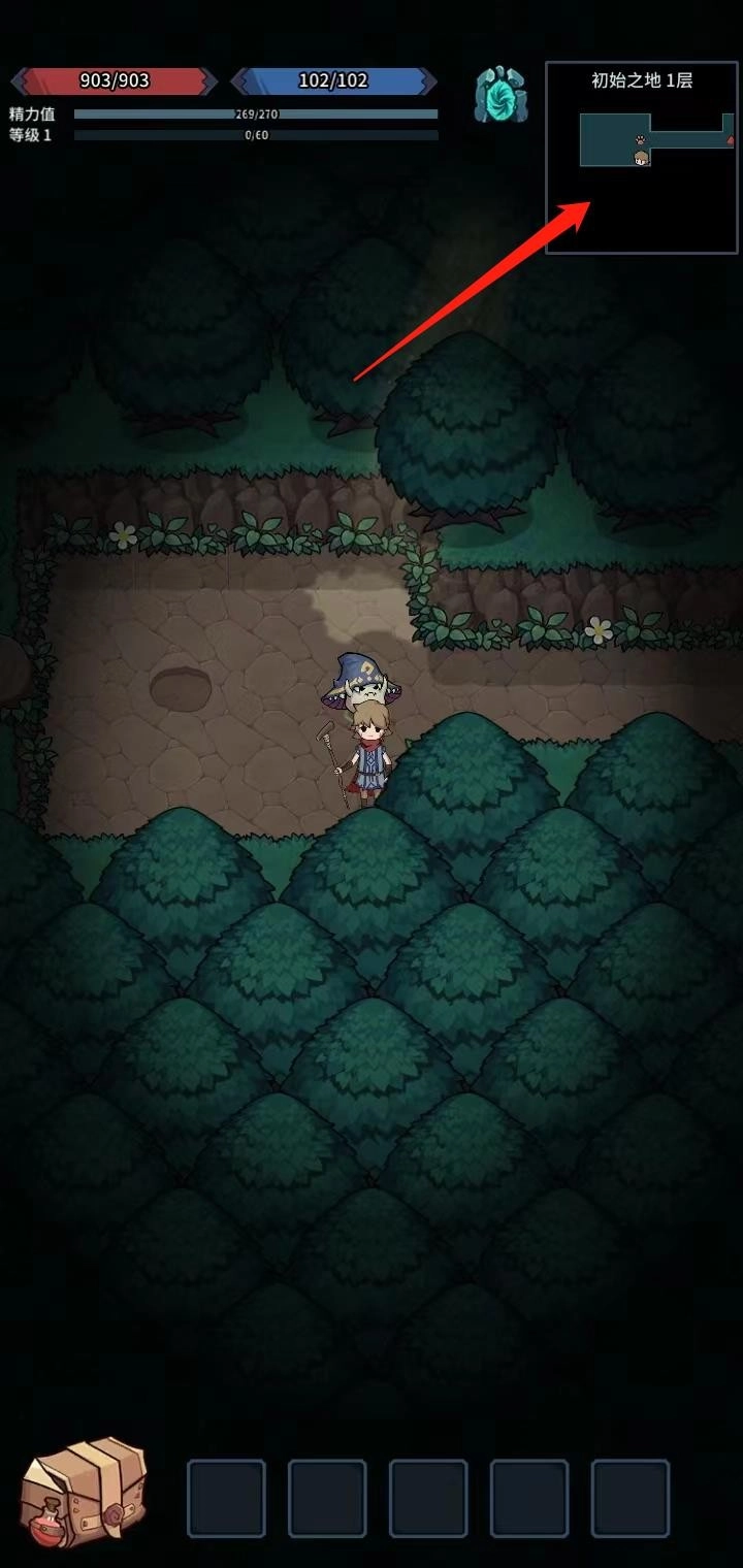 5、接下来玩家就可以开启冒险之旅了;在右上角可以查看自己所处的位置以及怪物所在的位置(红色三角形);
