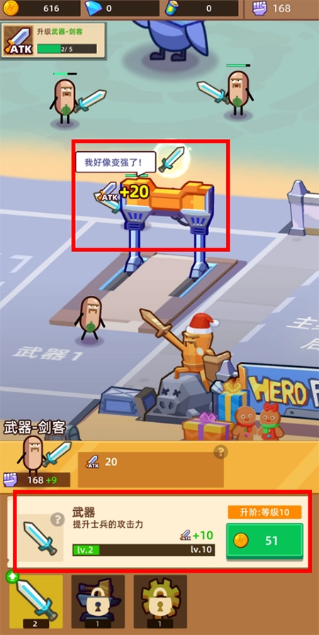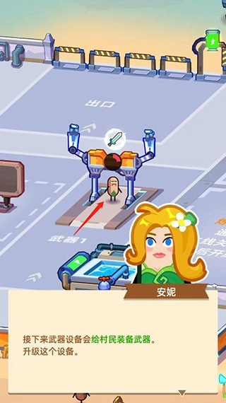 在工厂内有会有一个专业的武器设备给村民装备武器,不同的武器设备装备的英雄的职业也有所不同,而且这个武器设备是可以升级的,玩家同样是通过金币来为此进行升级,级别越高,英雄的战斗力就越高。