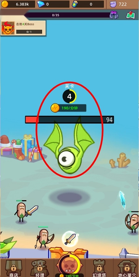 每个游戏关卡都会有一个boss,玩家需要使用制造出的英雄打败它们,之后即可获得金币奖励。玩家可以将金币奖励用在建设工厂,和升级英雄上。