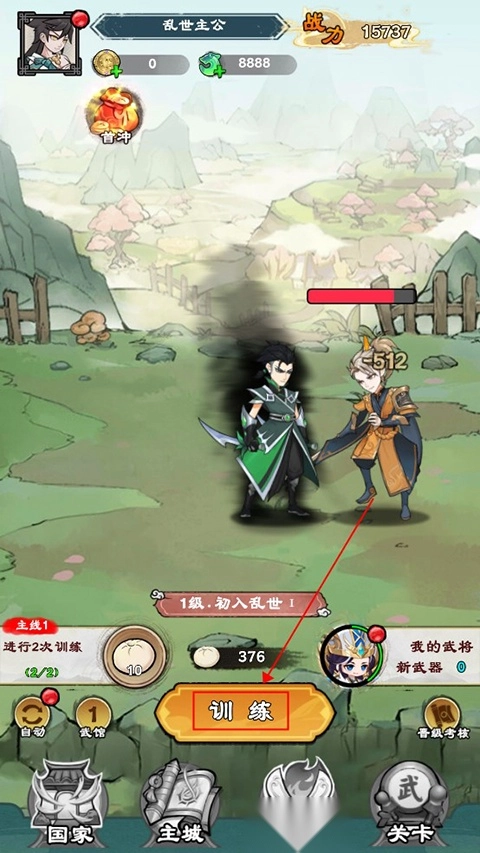 2、选择好职业就可以正式开始游戏啦,玩家点击下方训练,角色就会自动攻击敌人。