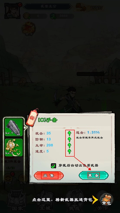 5、通过出售装备,可以获得金币奖励,金币可以用来提升武馆等级,增加高级装备刷出的概率。