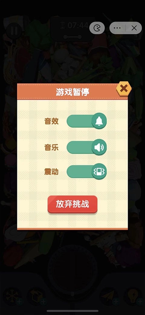 5、或者两个电子设备,拍照暂停,照片里找好蔬菜,按开始消除。