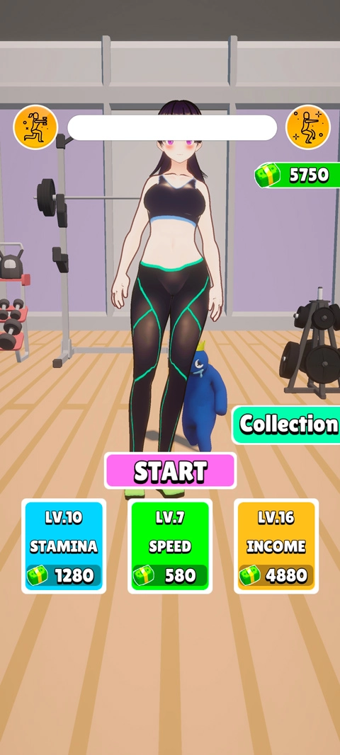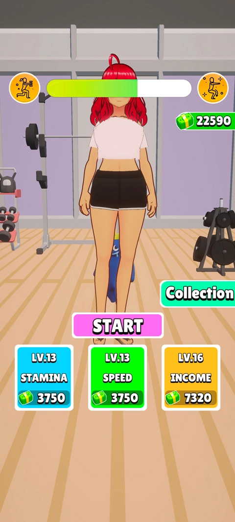 2、游戏拥有stamina耐力、 speed速度、 income收益三种数值可以进行选择升级,等级越高获得的加成也越高,提升耐力可以让女孩们的运动更加持久