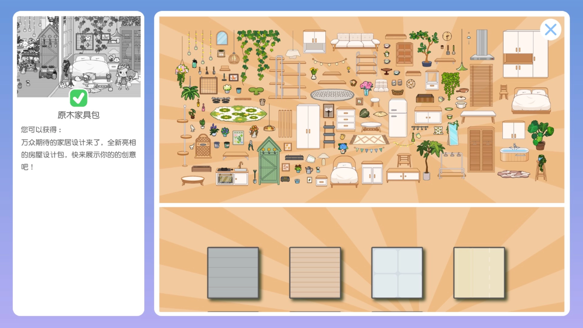 选择你想要的家具和服装套装,以原木家具套装为例
