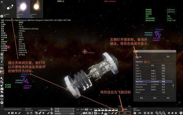 使用左侧的“查找”+“天体浏览器”,我们可以很方便地为飞船查找并勾选遥远天体作为目标。
