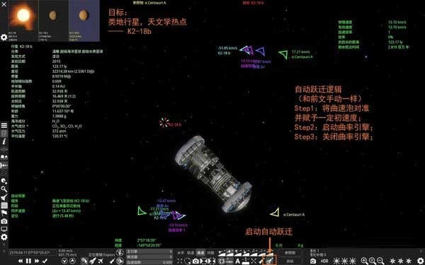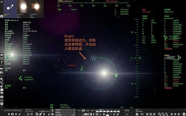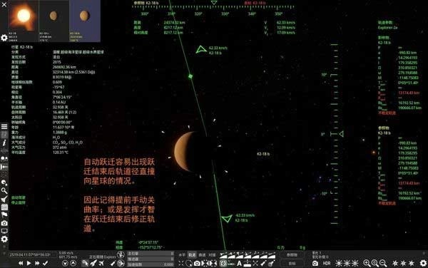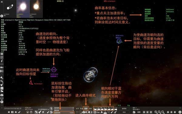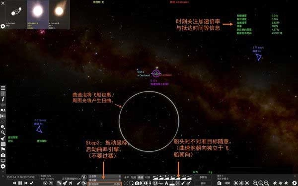 曲速航行结束后,记得暂停时间,手动切换参照物。这是由于曲速结束时,飞船轨迹可能会径直撞向天体,需要提前做好应对、修正稳定轨道。