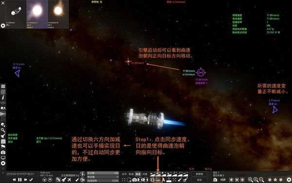 同步速度可以自动帮我们将曲速泡指向目标,这一过程可能需要一定时间,因此请确保飞船远离周围大型天体。为避免干扰视线,可随意点击远处将参照物设置为空。