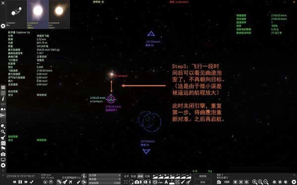 光年尺度的航行将放大一切误差,接近目的地时请重复以上步骤,修正曲速泡航向。保证紫色曲速泡方向永远指向目标。