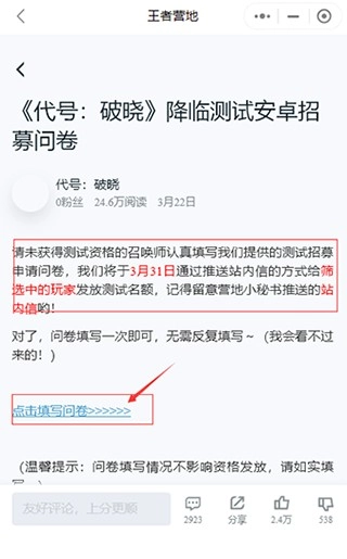 3、接着进入到招募计划的文章中,我们只需要根据要求填写调查问卷即可,参与之后只需要等待的通知即可,发放的时间在文章中都有提示;