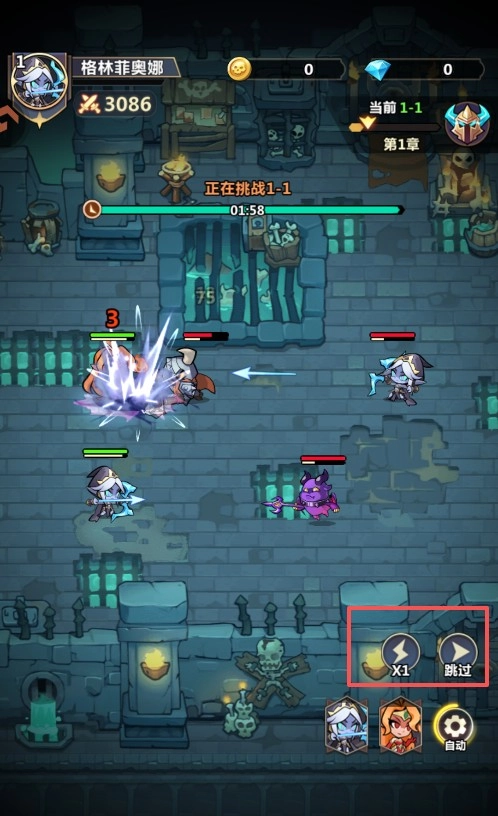 3、在游戏的战斗过程中,你可以通过滑动屏幕来移动整个队伍位置,可以用于躲避敌人的大招,此外,你可以点击屏幕右下角的图标加快战斗过程或者直接跳过战斗。