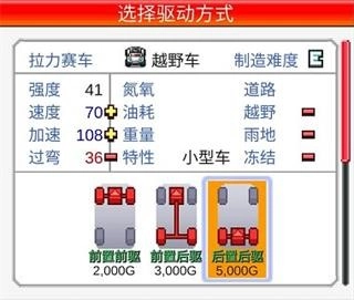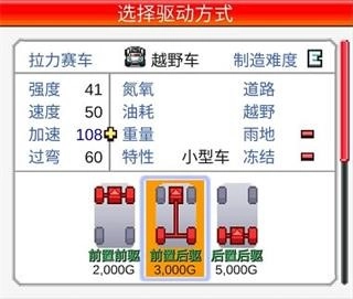 选择驱动方式,不同的驱动给车辆提供的属性提升与道路适应能力都是不一样的,而且并不是只有这三种引擎,后续还有更多哦~