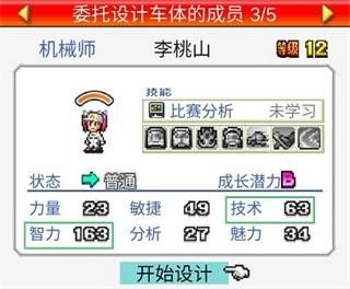赛车试跑——根据所选赛车手或机械师的“力量”属性和“分析”属性来提高赛车的属性
