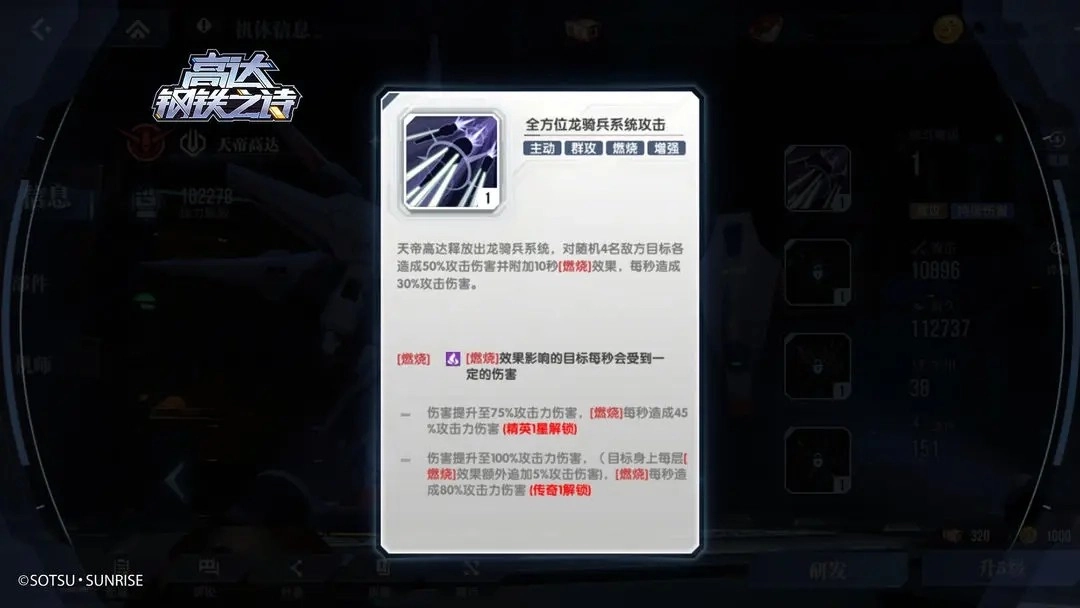 以自由高达为例,其主动技能【全炮门发射】在攻击带有“燃烧状态”的敌人时可获得额外增伤(需研发机体升星解锁)。若目标被该技能击坠(耐久值归零),自由高达可回复100能量。