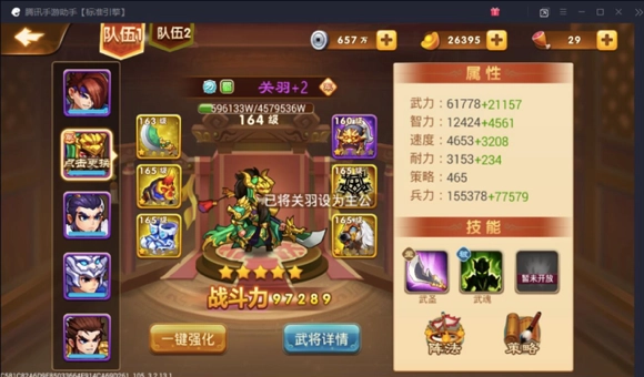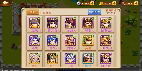到目前为止,这款游戏里总共有71名武将,具体来看,紫色武将有48名,蓝色武将14名,绿色武将则是9名。在我看来,武将大致能分成两类,一类是侧重智力的军师,另一类是侧重武力的将军,所以每个玩家都得搭配1名军师和4名将军才行。