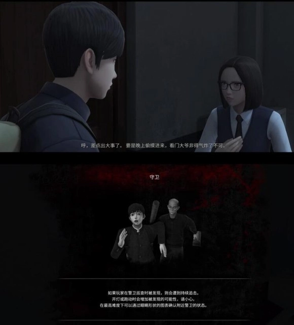 3、楼梯静步法。1.07之后的版本,跑向任何楼梯,上下楼都可以,(如果大爷追得比较近的话路上要关楼梯间的门,新楼的话先在美术室或者绕一圈甩开距离再去),在楼梯拐角处换走路慢慢离开就行。1.06之前的版本,必须和大爷拉开一定的距离(被大爷追得紧的话路上关两个门就可以),进楼梯间以后第一段楼梯最多跑一半就要换走路,以保证你有足够的时间离开而不被大爷的后续巡逻看到。