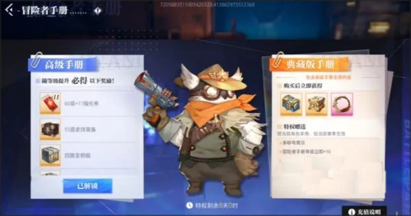 它分为两个版本,其中一个是高级手册,还有一个典藏版手册,购买完使用里面的道具就可以快速升级。高级手册中含有猫头鹰宠物以及60级+11强化券,冒险等级只要达到30级的话,还会赠送55史诗装备盲盒,以及64个回路圣物盲盒,还有粉色冒险徽记带以及奇馈礼盒。