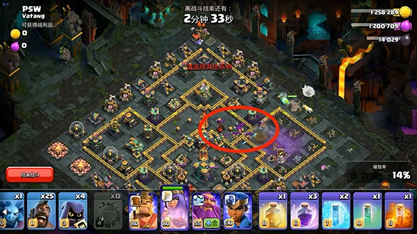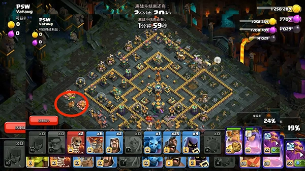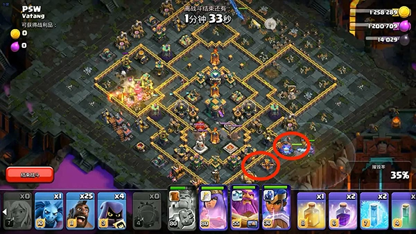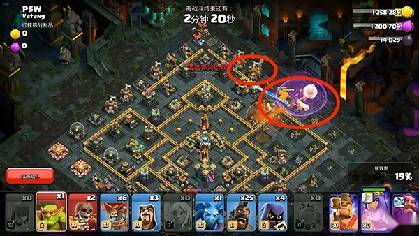 在部落援兵接近弓箭女皇时使用伤害药水法术和狂暴法术,并放置弓箭手和法师。同时在12点方向右侧放下隐秘哥布林清边。等弓箭女皇打完援兵就会自动从缺口处清理上方建筑。