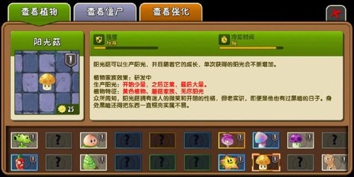 阳光菇这种植物开始的时候阳光只有二十五,但是随着他的成长他会逐渐成长到五十,然后就是一百,等于说后期一株阳光菇相当于两株向日葵,而且还可以省格子,说实话后期的话基本上每个人都会带。