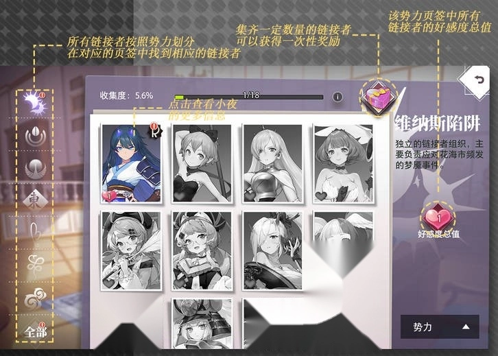 6 大势力共 60 + 链接者,未拥有角色灰色显示,已获得角色可点击查看详情并提升好感度。