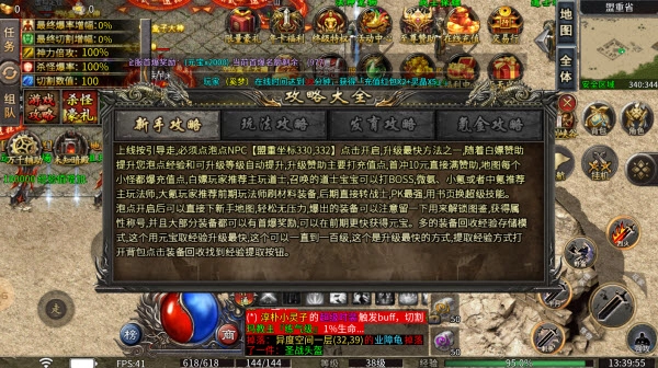 1、上线后请按照引导流程操作,务必找到泡点NPC【盟重坐标330,332】并点击开启泡点功能,这是升级最快的方法之一。随着白嫖赞助等级的提升,泡点经验和可升级上限会自动增加,提升赞助等级主要通过打充值点实现;首充10元可直接满赞助,游戏内每张地图的小怪都会掉落充值点。职业选择方面,白嫖玩家推荐优先玩道士,召唤的道士宝宝能协助挑战BOSS;微氪、小氪或中氪玩家建议主玩法师;大氪玩家推荐前期用法师刷材料和装备,后期转玩战士(PK最强),可通过书页兑换超级技能。