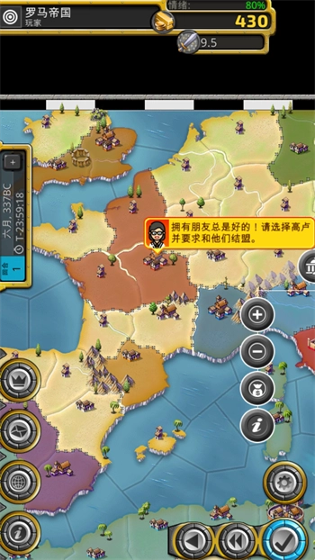 3、玩家要尽你最大的能力让你的国家人民高兴。你与其他国家结盟一起对抗你的敌人。功能范围有扩张、外交和管理国家财政和经济性。