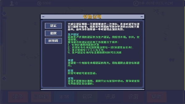 3.点击“帮助”可查看帮助说明,了解建筑、居民、科技树等核心玩法的规则,如建筑维护、生产建筑运作条件等,助力游戏上手。