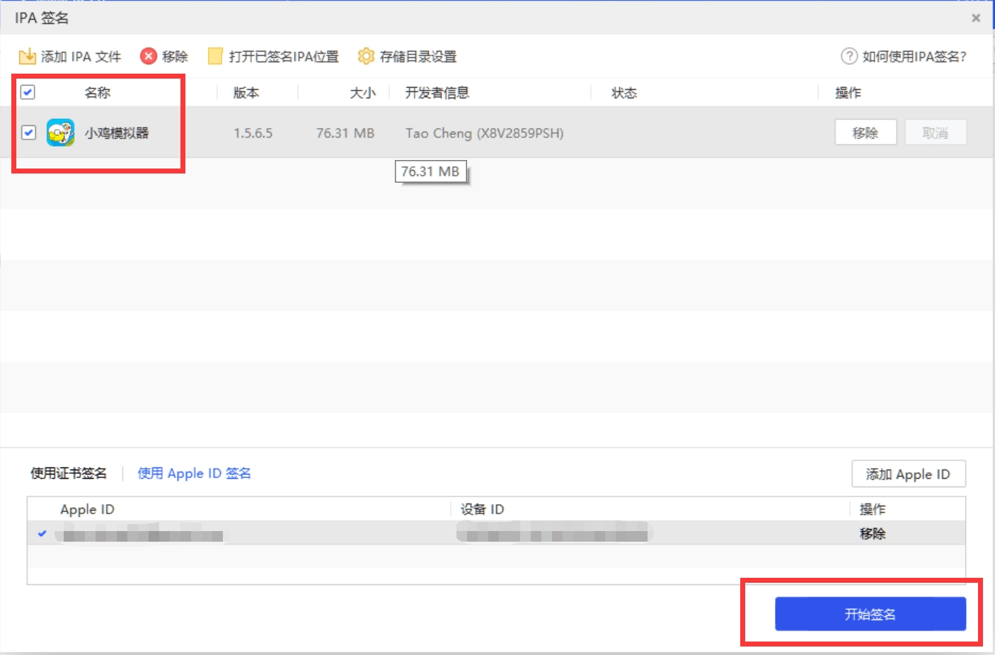 第四步、上方列表框内选中签名IPA文件,并在右下方点击“开始签名”按钮。