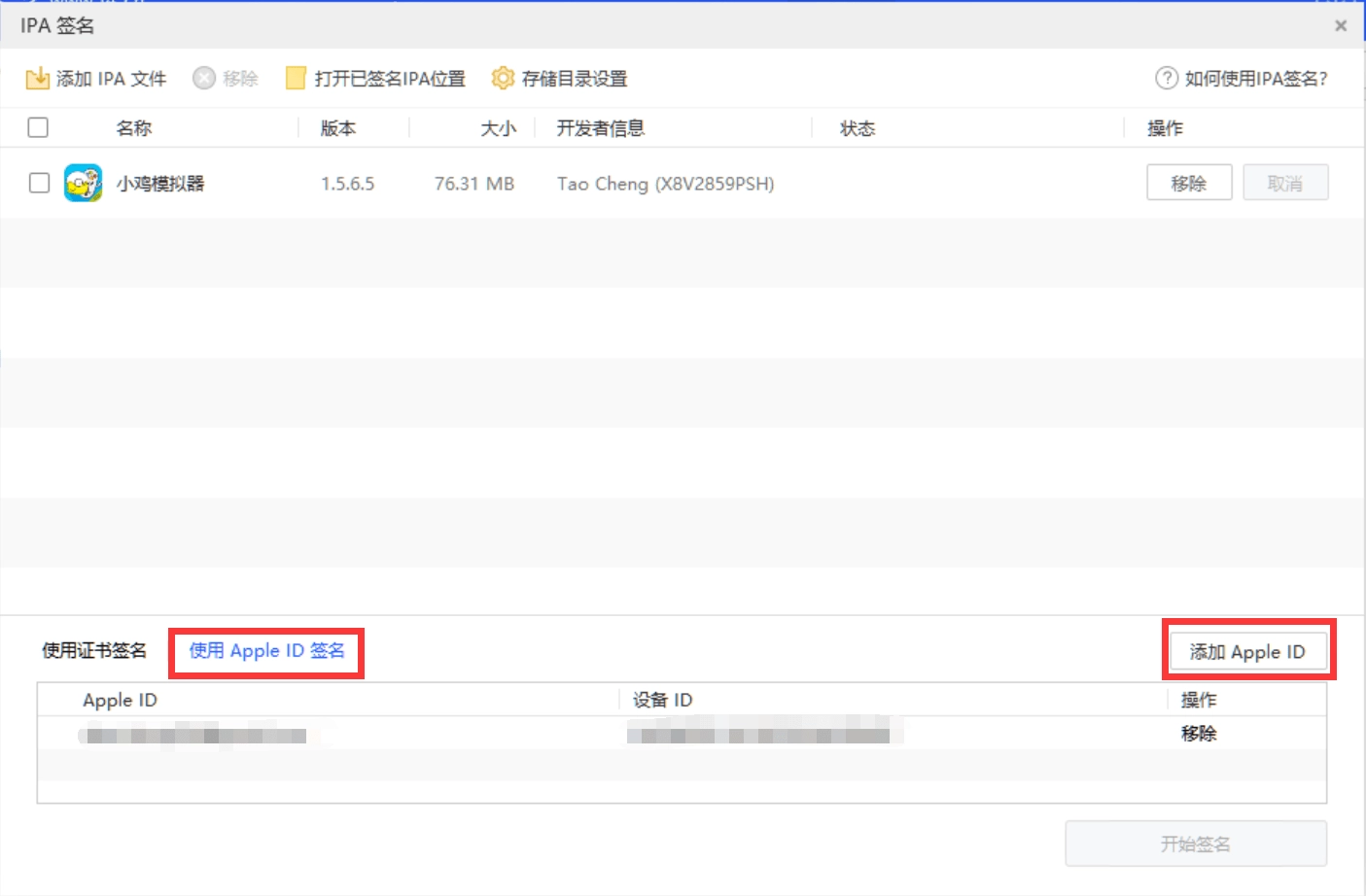 第三步、当选择IPA文件完成后,点击左下方“使用Apple ID 签名”,如果列表中没有可用ID,则需要在右方点击“添加Apple ID”按钮,并选择添加操作。