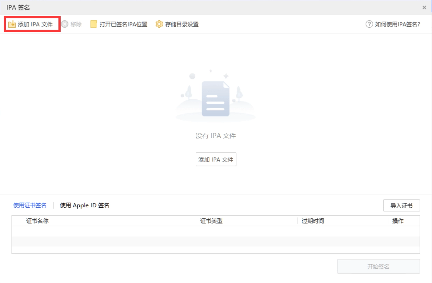 第二步、进入IPA签名页面,点击右上角“添加IPA文件”操作,在弹出框中选择需要签名的IPA文件。