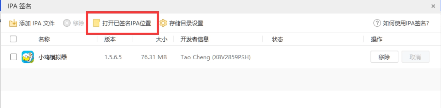 第五步、待签名完成后,则可点击左上方的“打开已签名IPA位置”,找到完成签名的IPA文件。