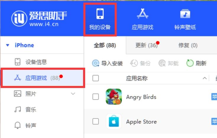 第六步、保证手机正常连接爱思助手,随后在爱思助手顶部导航栏处选择“我的设备”,并在左边菜单栏中选择“应用游戏”,即可展现当前手机所安装的应用游戏列表。