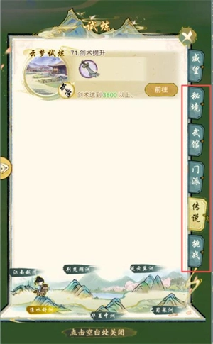 3、剑意获取:试炼中挑战部分的二、四、六段挑战胜利可获取剑意,同时这三段的收集奖励也有很多外功奖励比较推荐,其中二段、四段如果是单纯为了获取剑意不推荐50精力不如去地图砍练剑桩。七日目标中第二、五、六、七天有剑意补充礼包,进行试炼中的传说试炼白玉宫龙女试炼和蝶仙谷蝶仙试炼也会给很多剑意。