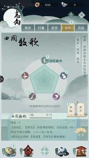 权重最高的志向为主志向,在庭院中将更倾向于行,行为获得经验将翻倍。