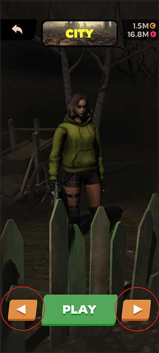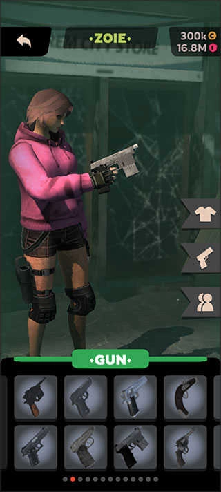 玩家点击首页store即可进入商店,可以切换人物以及衣服,也可以购买武器。