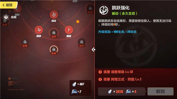 跳跃反击则是在反击后对敌人施加雷锁效果,作为11级和12级的技能,可以在未拥有16级技能“雷翼”的情况下对敌人释放雷锁,方便配合对雷锁状态下加伤的技能。