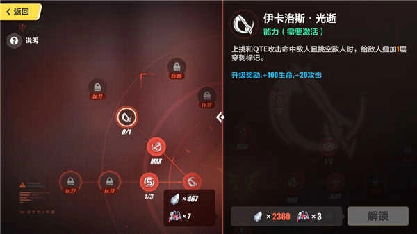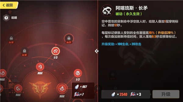 下面一栏的话可以考虑点出“跳跃强化”反击后对敌人施加脆弱状态提高全伤害。