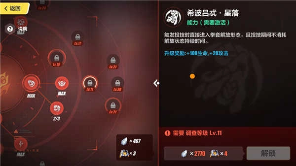 右侧一栏中的“星落”可以让卡萝尔进入拳套解放状态,且期间不会消耗解放状态时间,建议11级时就点出。(下图为解放状态的讲解)