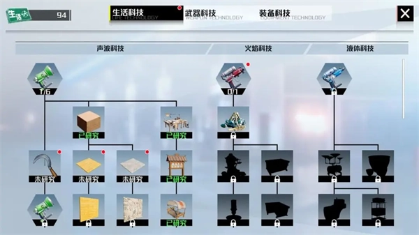 二,科技升级要优先基本需求科技升级是游戏前期的基本操作,但科技树中很多选项都不是刚需。根据人物的生命指标,我们应当用生活经验优先解锁声波采集器、木床、火焰工具、篝火、液体工具、蓄水器、淋浴和马桶,这样才能保持健康探险。像资源比较多地方,完全可以把这几个设施简单的布置一下,然后就能来一波彻头彻尾的大收刮。