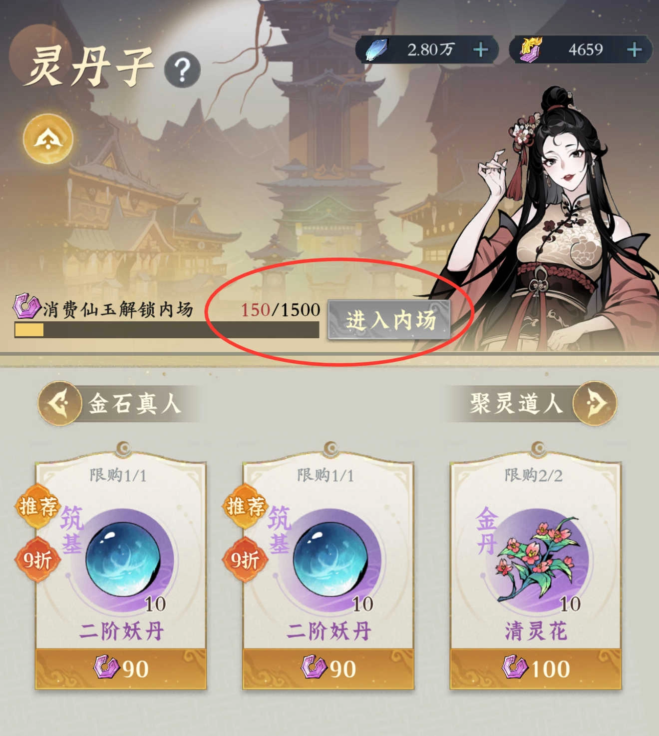 3. 利用仙坊资源:每天在仙市坊购买丹药、药材和聚灵石等资源,消费满1500仙玉可进入内场,内场有大量丹药和高性价比的1折聚灵石出售。