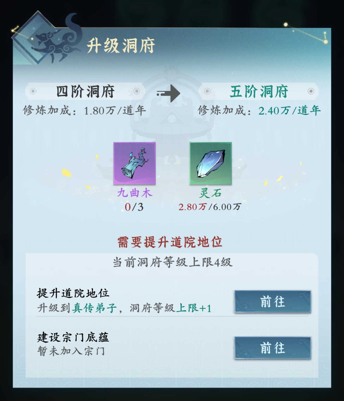 1. 洞府升级:洞府升级可加快自动吐纳灵气的速度,升级所需的九曲木可通过参与宗门活动,完成宗门贡献任务来兑换获取。