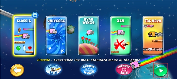 游戏内设置了多种模式可供选择,涵盖经典模式(Classic)、宇宙模式(Universe)、彩虹翅膀模式(Nyan Wings)、禅模式(Zen)以及塔克南模式(Tac Nayn),不同模式各自具备独特的挑战任务与隐藏彩蛋。