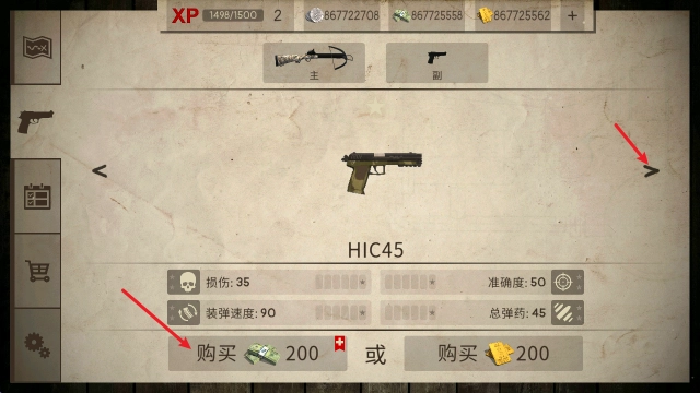 2、武器分为了主副武器,进入后点击箭头即可切换不同武器,随后可以进行购买。