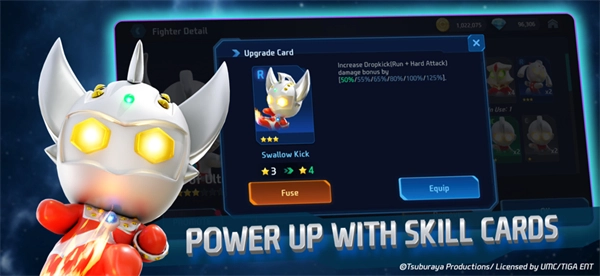 游戏中除了经典的战斗外,还有独特的技能卡牌系统,玩家可以为不同的奥特曼和怪兽装备各种卡牌来获得新的技能,通过使用这些技能来击败你的对手来获得胜利,而且这些卡牌还可以通过融合来获得新的连击招式与能力,不断解锁更多厉害的招式成为最厉害的玩家吧。
