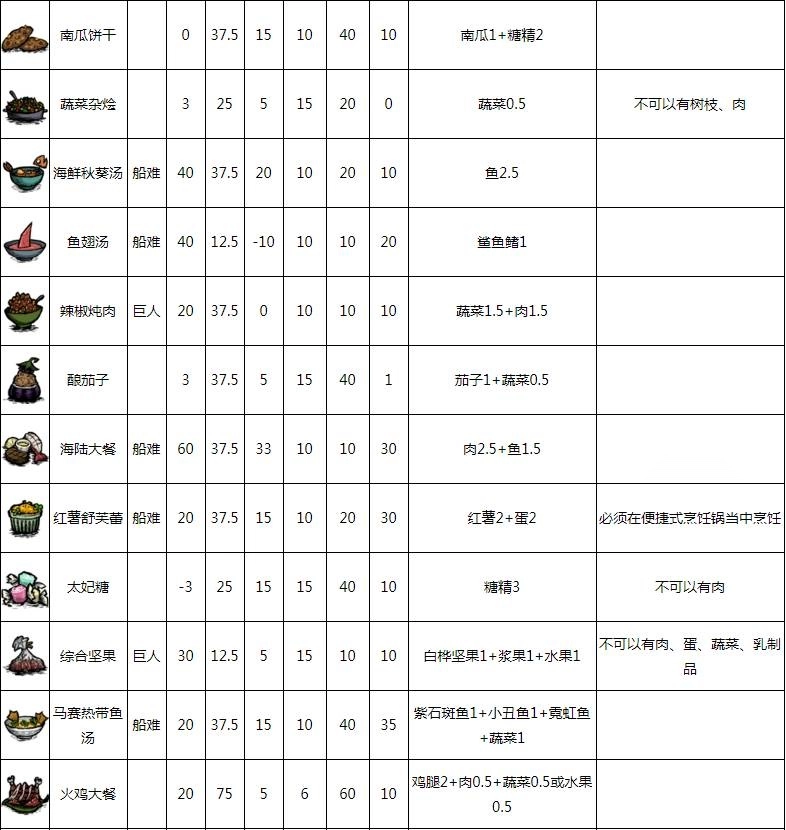 1、本列表当中所涉及的食谱仅包含原版游戏及DLC内容,不包含任何游戏MOD。饥荒联机版食谱配方一