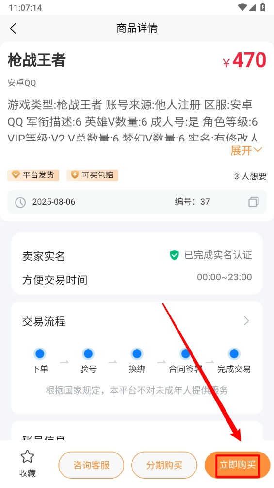 5、选择相应的游戏账号进入详情页查看交易详情页,最后点击"立即购买"即可。