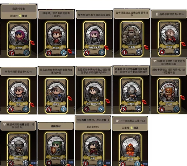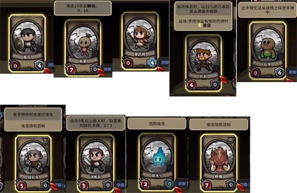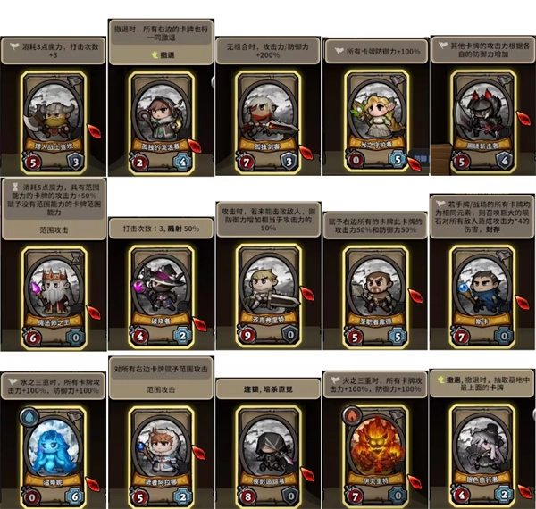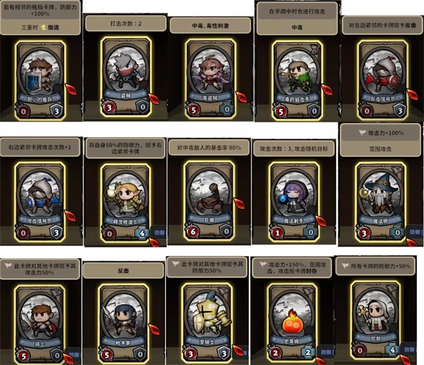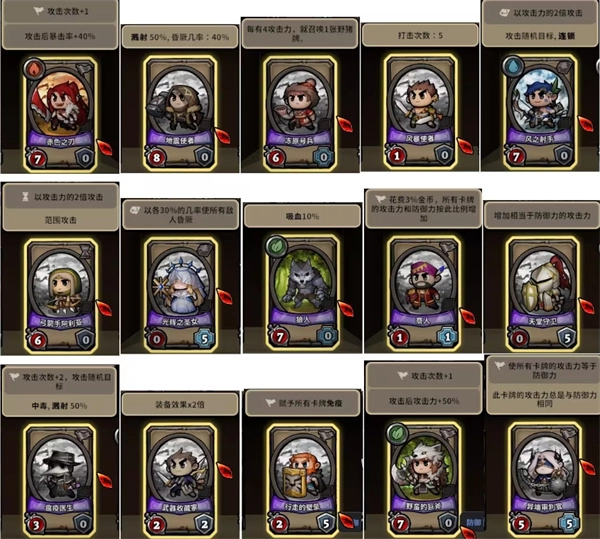 这个卡牌共有5个等级,按从低到高排序依次为:普卡、银卡、金卡、紫卡和橙卡。其中普卡仅在基础牌组中出现,橙卡则只存在于地图的召唤阵里。所有卡牌均可升级,升级后不仅能获得一个装备格子,部分卡牌自身的效果也会随之增强。