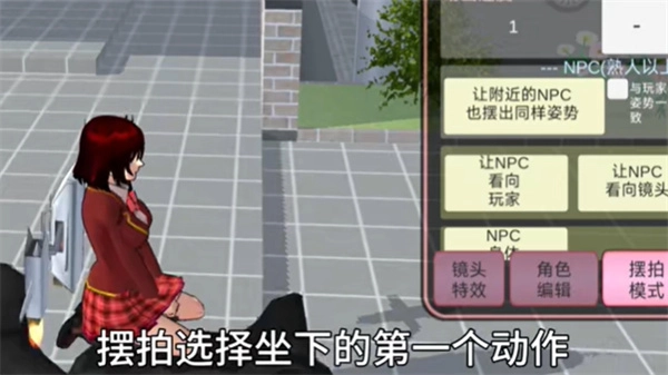 2、再调整到女主角色脚下,打开喷气背包,挑整萌宠大小以及位置,摆拍选择坐下的第一个动作。