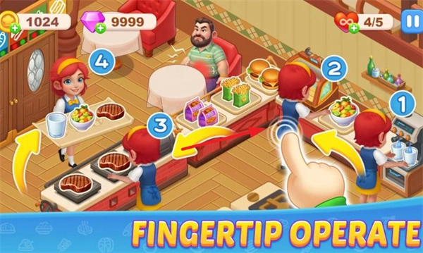 2、记得不断烹制精致菜肴,满足不同口味的顾客,同时还能赚取收益,购买和升级厨房设备,聘请顶级厨师和服务员。