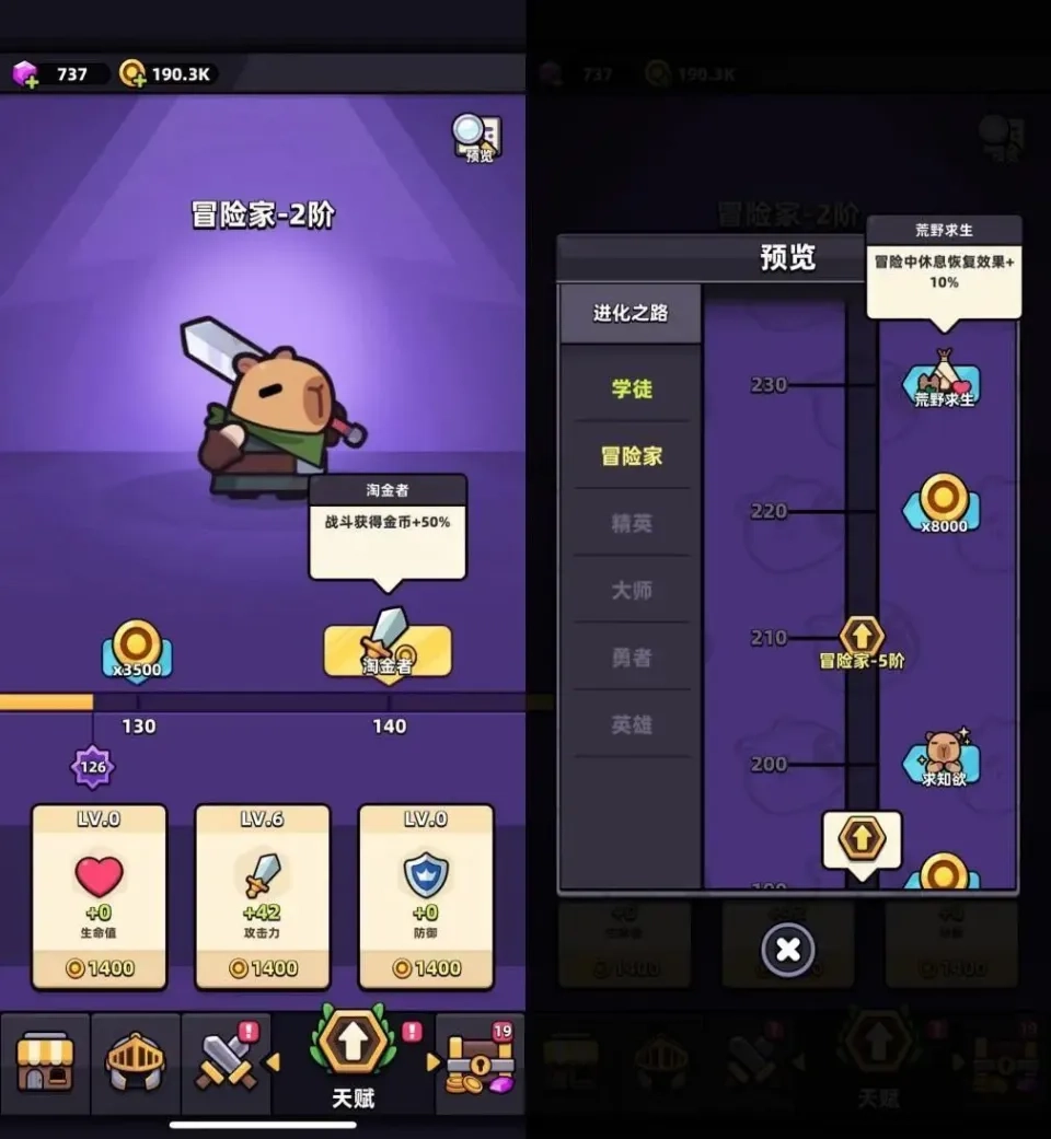 丰富的养成系统 :从天赋到装备,从宠物到宝箱,每一次升级都是对你探险能力的增强。收集、升级、合成,打造属于你的最强水豚。